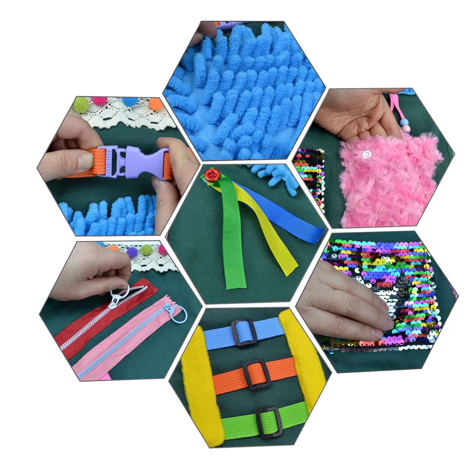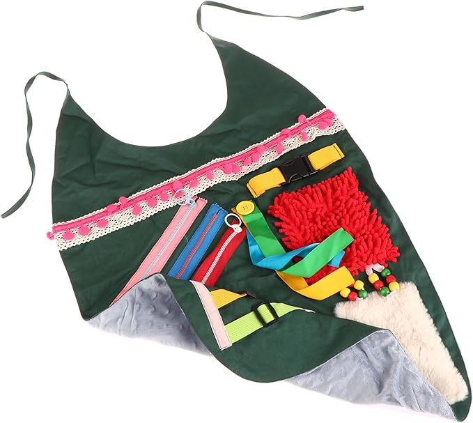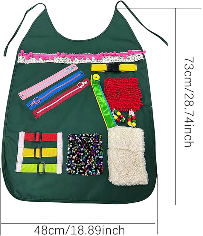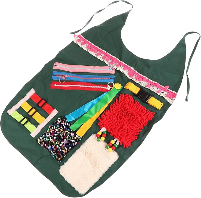 • El delantal sensorial tiene varias actividades de mano para mejorar la destreza de los dedos y la coordinación de manos y ojos.